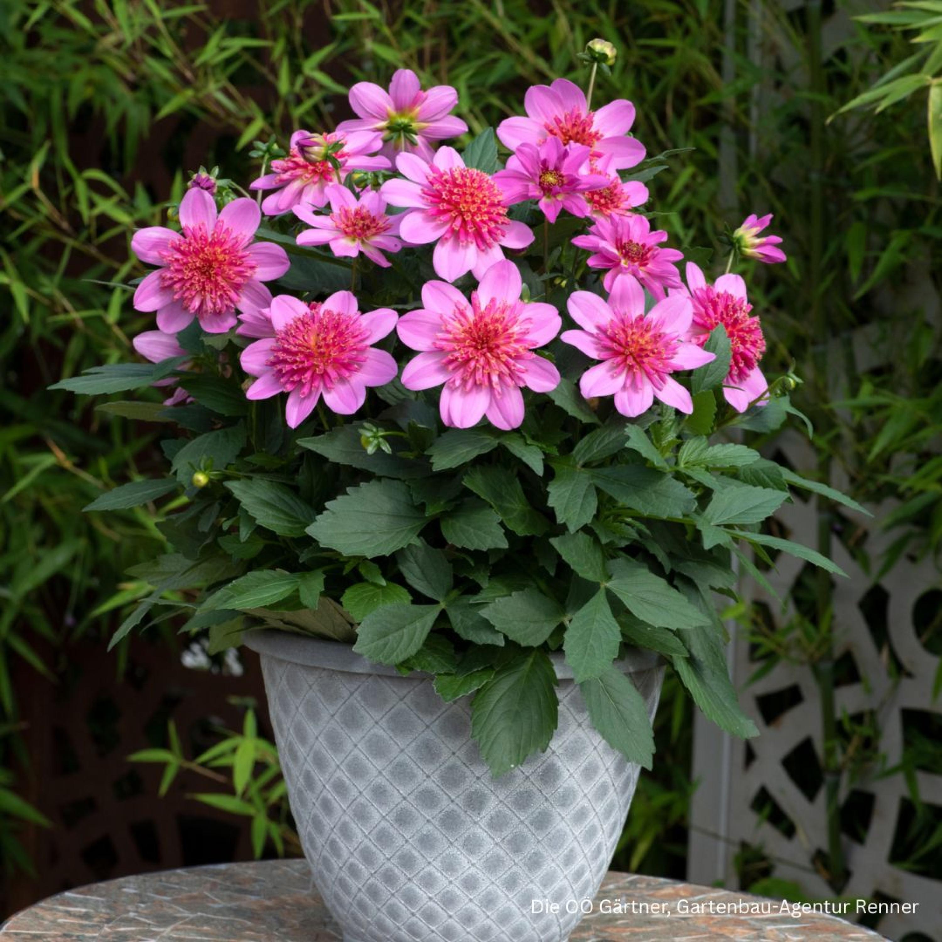 Die „Fesche Frieda“ zeigt sich besonders auffällig gefüllt: kräftiges Pink in der Mitte, zartes Rosa außen. Für kleine, kompakte Blumensträuße eignet sie sich als haltbare Schnittblume.